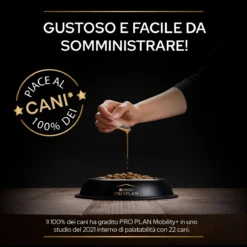 Pro Plan Supplements Mobility + è un alimento complementare per cani adulti di tutte le taglie che supporta le articolazioni del tuo cane grazie ad una miscela concentrata di membrana d’uovo (fonte di collagene), acido ialuronico purificato, valve di cozze verdi e glucosamina.