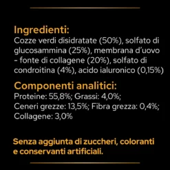 Composizione: Cozze verdi disidratate (50%), Solfato di glucosamina (25%), Membrana d’uovo* (20%), Solfato di condroitina (4%), Acido ialuronico (0,15%). *fonte di collagene