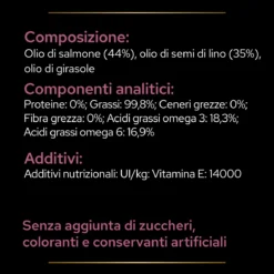 Composizione: Olio di salmone (44%), Olio di semi di lino (35%), Olio di girasole.